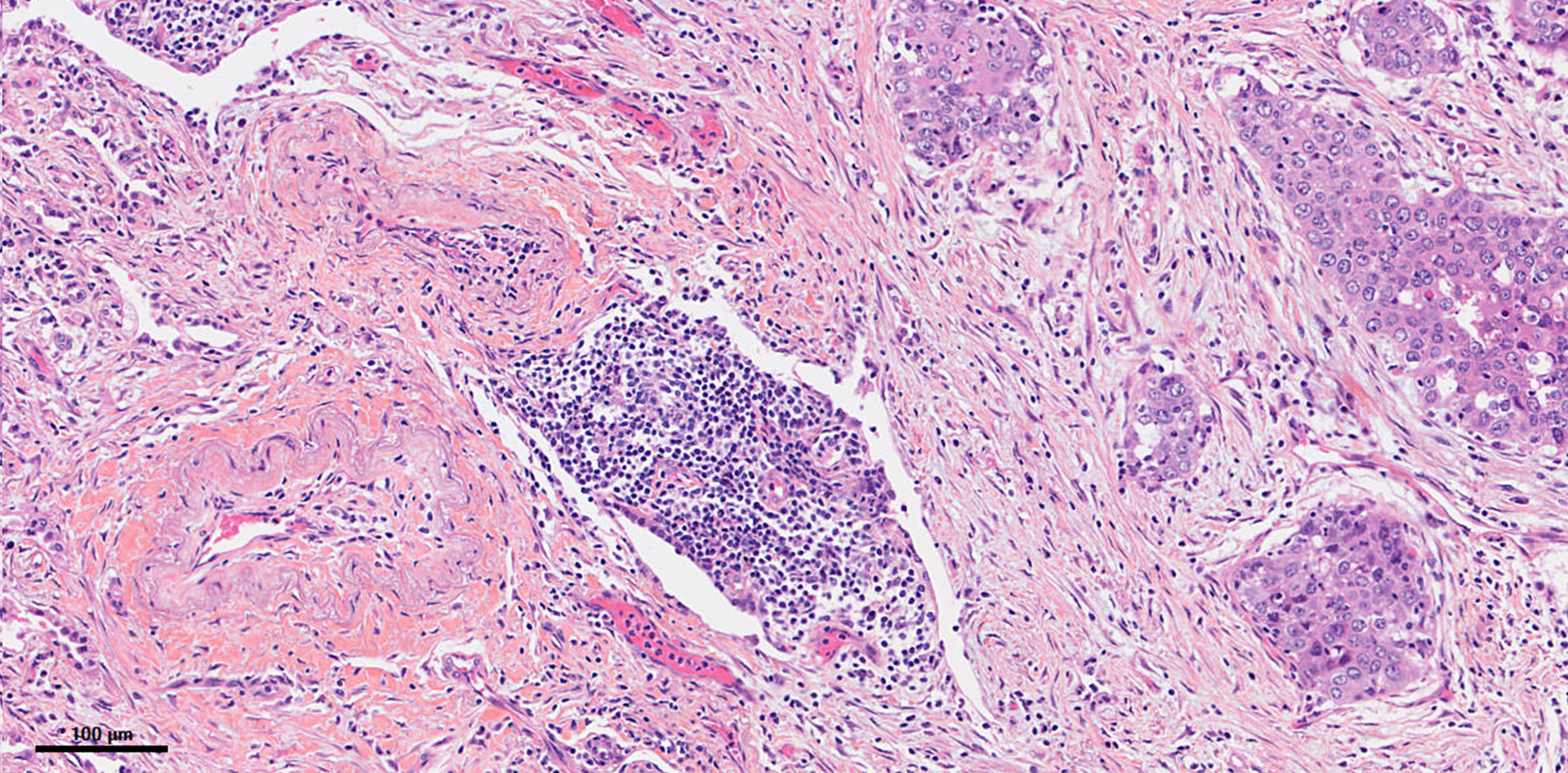 Illustration of a mature TLS detected in a primary pancreatic adenocarcinoma.